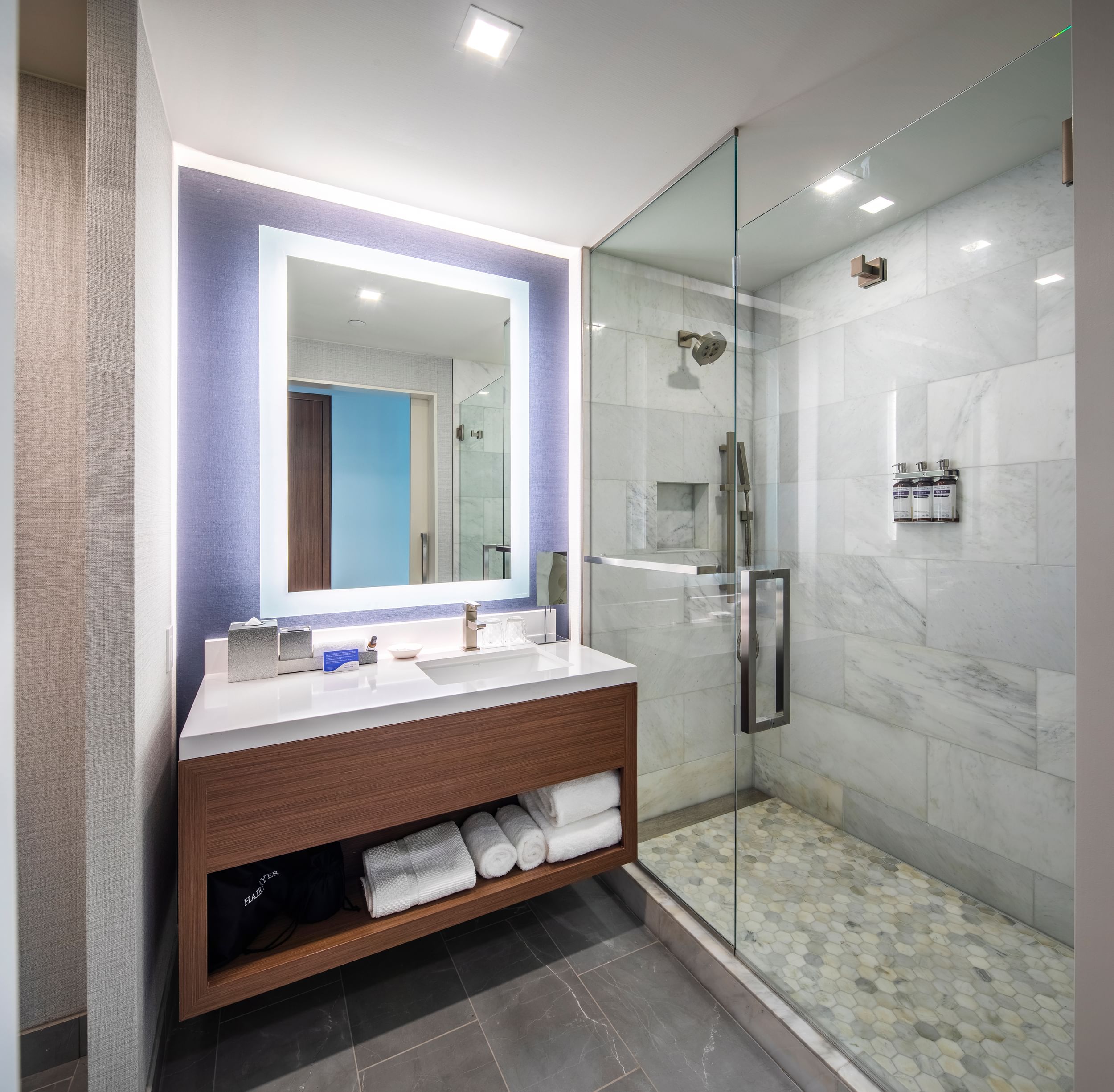 Consistent with KPMG’s focus on anticipating and understanding emerging trends, the facility’s Innovation Center provided an immersive learning experience that enhanced the skills KPMG professionals brought to client situations. The 800 bathroom pods had arrived onsite as fully functional and outfitted bathrooms, complete with fixtures and tiles. These pods were produced in a climate-controlled factory out of our Orlando facility, ensuring high quality and consistency.