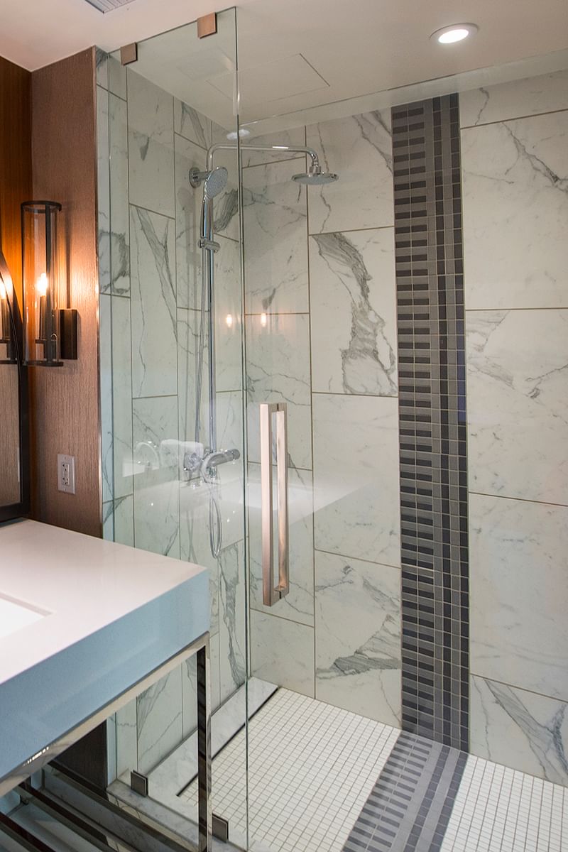 The Omni Louisville hotel served as the cornerstone of the city’s most exclusive entertainment, retail, and office district, “Fourth Street Live!” It featured 612 finely appointed guestrooms that with luxurious quartz finishes and a choice between walk-in showers or bathtubs. The showers in the king rooms had rotating heads with preset temperature settings, and all bathrooms showcased intricately detailed tile work in the tub and shower areas.