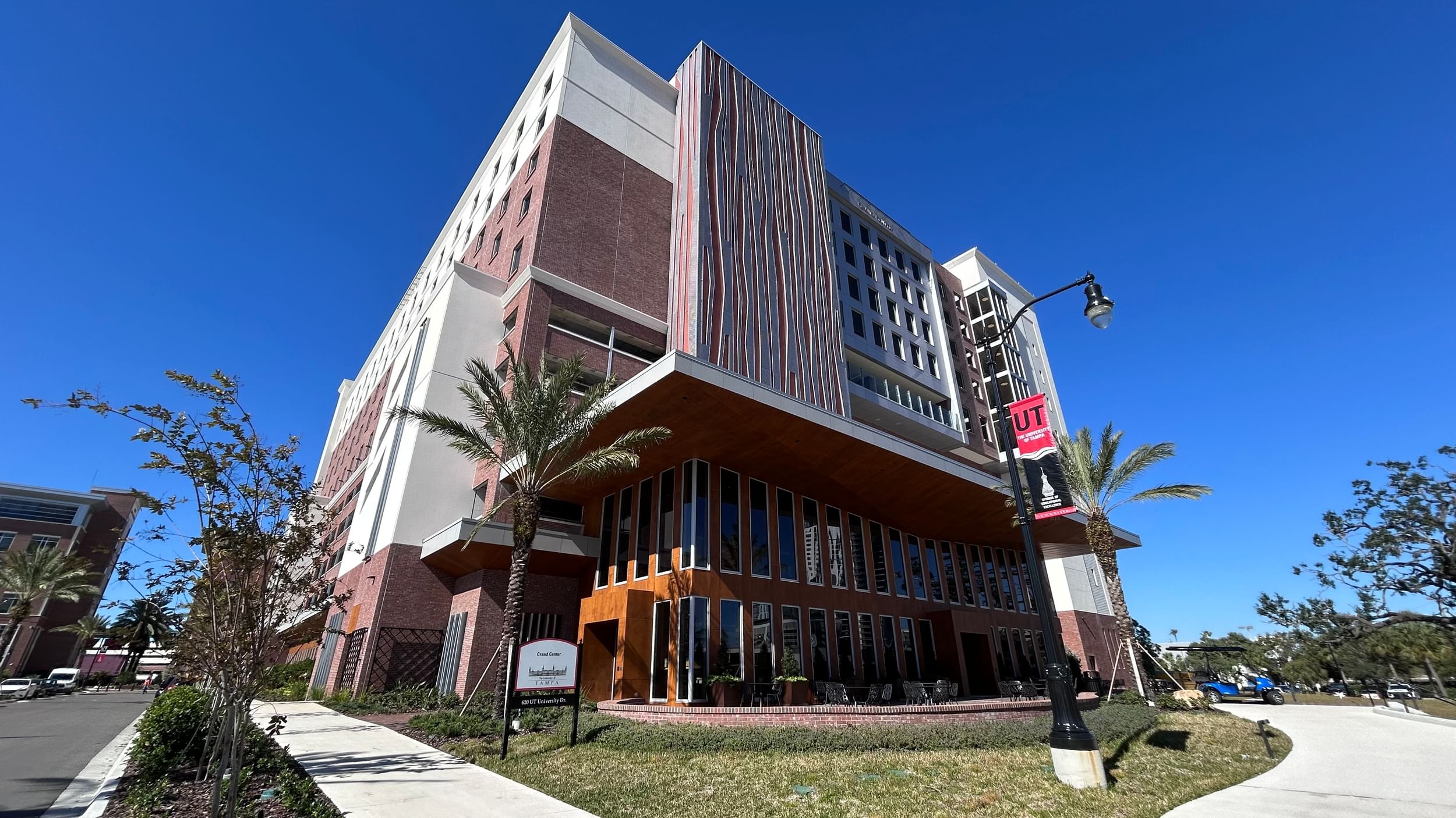 The University of Tampa (UTampa) built the new 10-story Grand Center on its campus, it’s largest building yet. The building features three main components: a residence hall for over 600 students, academic and student support facilities including faculty offices, classrooms, study spaces, and offices for various departments, and a parking facility for over 400 vehicles.
